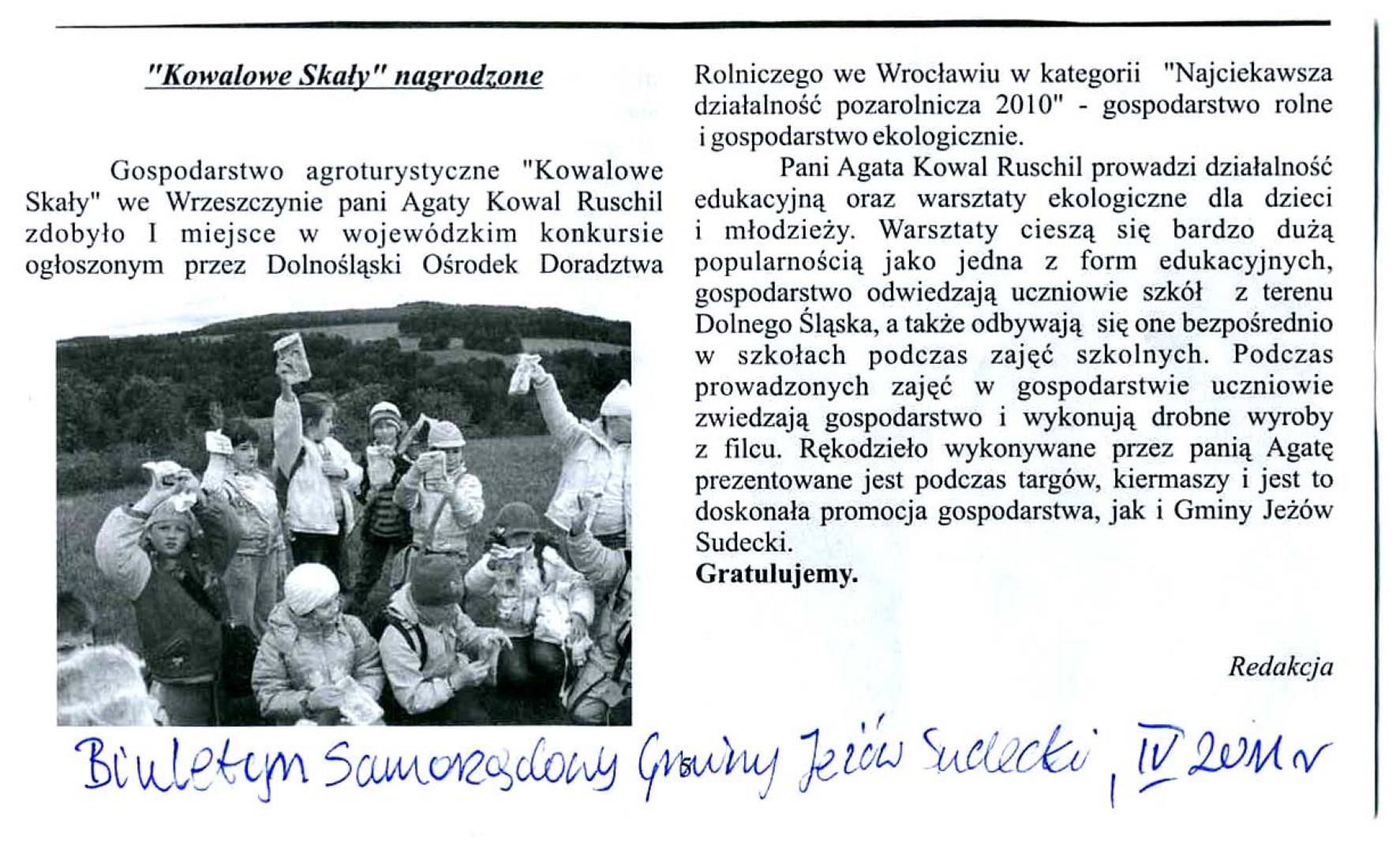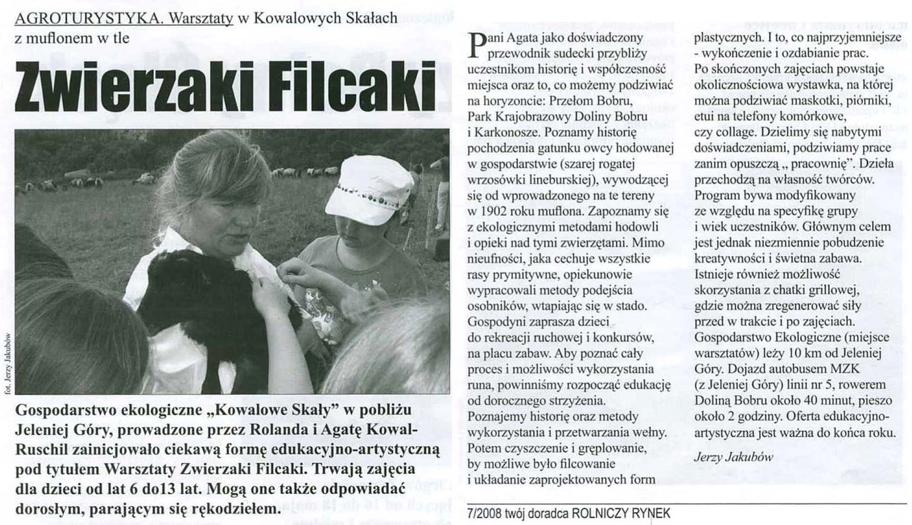 Miał być zielony kawałek ziemi za miastem… Marzyliśmy o drewnianym domku z widokiem na góry… Marzenia się u-RZECZY-wistniają. Odkryliśmy na mapie? Kowalowe Skały? Ja Agata Kowal i mój mąż - wnuk kowala. Czy to przypadek? Na łące, gdzie przedtem spały sarny, powstał dom i całe gospodarstwo.